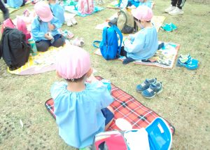 楽しみにしていたお昼の時間は、それぞれにレジャーシートを敷いておにぎりをパクリ!!早くも持ってきたおやつを見せてくれる子も!!