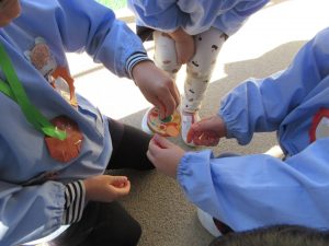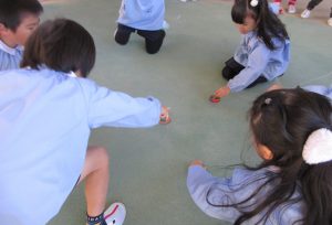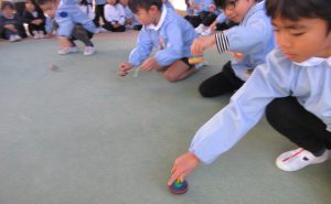 チャンピオンになって大喜びする子も、負けて涙する子もいたこま回し大会となりましたが、最後は、応援に来てくれた年少さん、年中さんにこまの回し方を教えてくれた年長さん!さっきまで泣いていた子も、すっかり優しい顔になっていました♪